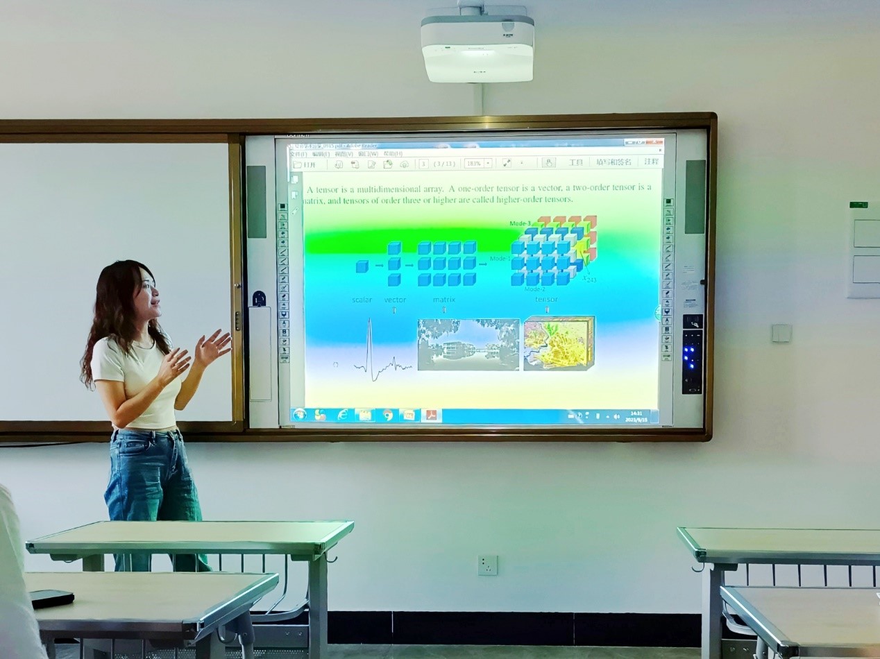 其后,冯庆蓉介绍了自己研究的大致内容,即数字图像处理。首先从标量、向量、矩阵到张量四个维度分别对生活中的数字图像进行了描述;其次,冯庆蓉指出其研究背景是:在采集过程中,图像不可避免地会遭受到退化,这时就需要对退化的图像进行一定的处理:内容包括去噪、去雾、修复等;接着,冯庆蓉介绍自己的主要工作是通过刻画图像的本质特征,提出了泊松图像去模糊的算法,并通过一系列的数值实验证实了所提模型的有效性;最后,冯庆蓉介绍了其研究内容在实例中的应用,例如:彩色图像、推荐系统、人脸对齐、视频监控等。