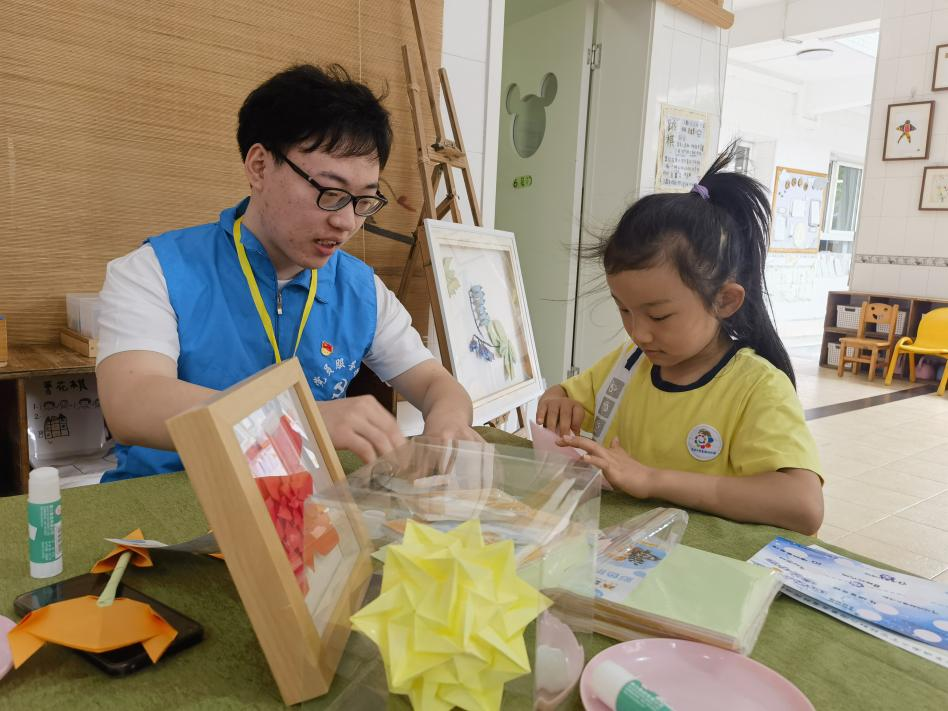 活动于 9:00 正式拉开帷幕,充满活力的幼儿园教室里,志愿者们根据不同年龄段幼儿的认知特点,精心设计并开展了循序渐进的折纸教学任务。在小班活动区域,志愿者们手持彩纸,耐心地向小朋友们示范菱形的折叠方法。“小朋友们看,把纸的角对齐,轻轻折一下,就像变魔术一样哦!”志愿者温柔的话语,成功吸引了孩子们的注意力。孩子们稚嫩的小手认真地模仿着,虽然动作有些笨拙,但眼神中满是专注。当一个个歪歪扭扭的菱形在他们手中成型时,教室里响起了此起彼伏的欢呼声:“老师,我折好啦!”“我的菱形像钻石一样!” 通过折叠菱形,孩子们不仅初步感知了边角关系,更在动手操作中建立起对几何图形的基础认知。