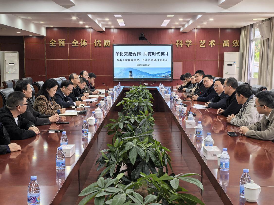 11月14日,学院一行前往开州中学开展调研。开州中学党委书记许少宛、董事长邹俊、副书记王小凡、副董事长明道毅、陈勇与学院员工代表出席会议并与学院一行开展座谈。会上,开州中学邹俊、明道毅、教师发展中心主任聂贞福、员工郭俊分别就开州中学的基本情况、团队需求、竞赛工作、人才培养意见建议等进行主题发言,双方就本研衔接背景下的公费师范生培养、数学学科竞赛合作路径和实习实践基地建设等议题深入交流,为后续访企拓岗、校地协同育人搭建了坚实桥梁。