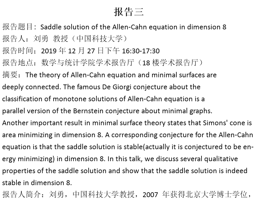 报告人简介:刘轼波,男, 1975年生于广东.在兰州大学获得学士和硕士学位后,到中科院数学所学习,于2003年获得博士学位. 2005年从北京大学数学研究所博士后出站,到厦门大学任副教授. 2008年任汕头大学教授, 2011年任厦门大学教授.现为厦门大学数学系教授、博士生导师.先后主持国家自然科学基金青年项目和面上项目,以及福建省杰出青年基金项目. 2013年入选意大利国际理论物理中心(ICTP)协联成员, 2017年受国家留学基金委资助到美国圣母大学访问一年.他的研究领域是非线性泛函分析、非线性偏微分方程的变分方法.
