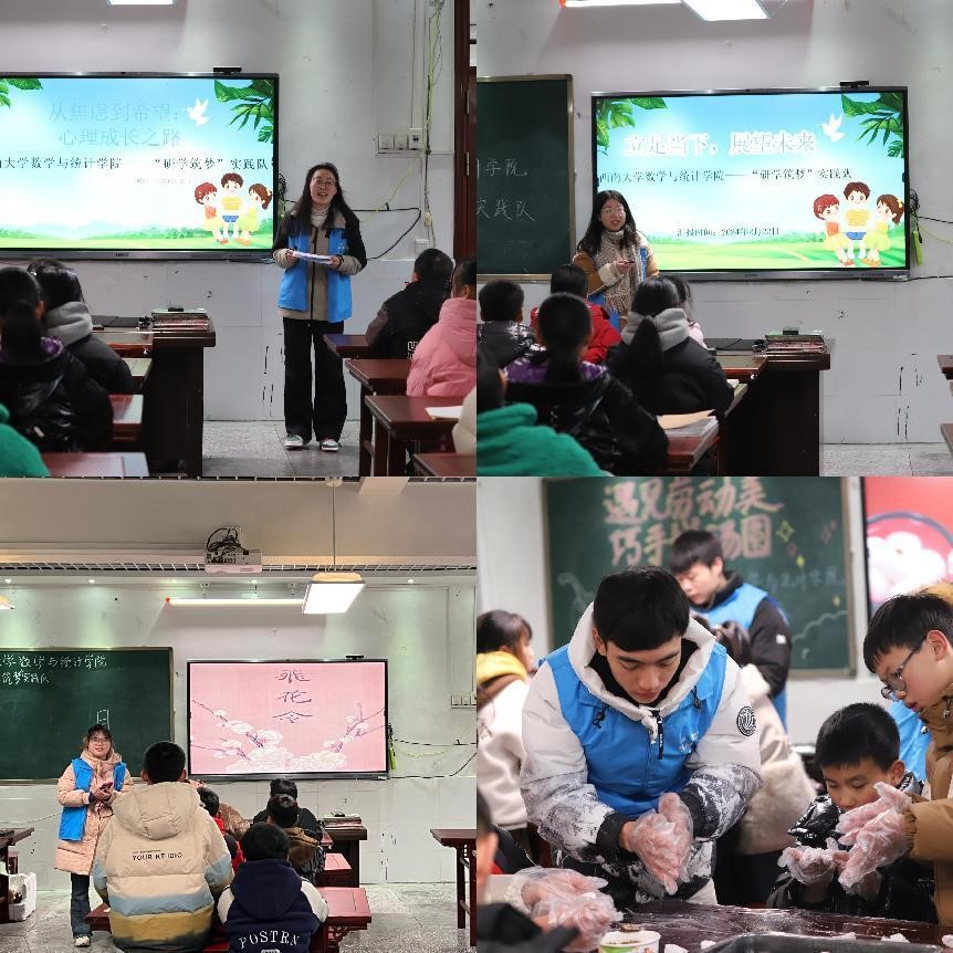 针对咸宜小学留守儿童较多、春节收假收心等员工情况和教学需求,实践队设计了以分离焦虑应对、不做“手机控”、成长梦想等为主题的9节特色实践课程。课程不仅涵盖人文教育、情感教育、劳动教育、心理帮扶、学业规划等内容,还结合学院特色和地方特色,对数学思维和文化、城口红色历史进行了介绍,为同学们带去了有趣、有益的学习体验。
