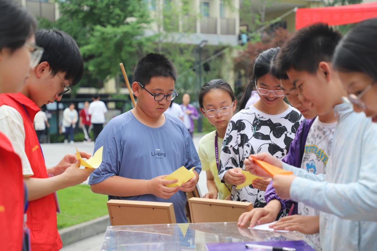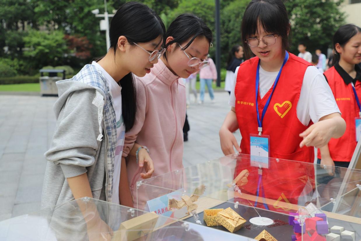 在志愿者耐心细致的指导下,展区里充满了沙沙的折纸声。不一会儿,一个个精巧的作品在同学们手中诞生:棱角分明的正方体诠释着空间几何的秩序之美,灵动的纸鹤翅膀暗含对称变换的规律。看着自己的成果,同学们脸上绽放出灿烂的笑容,眼中闪烁着发现数学之美的光芒。