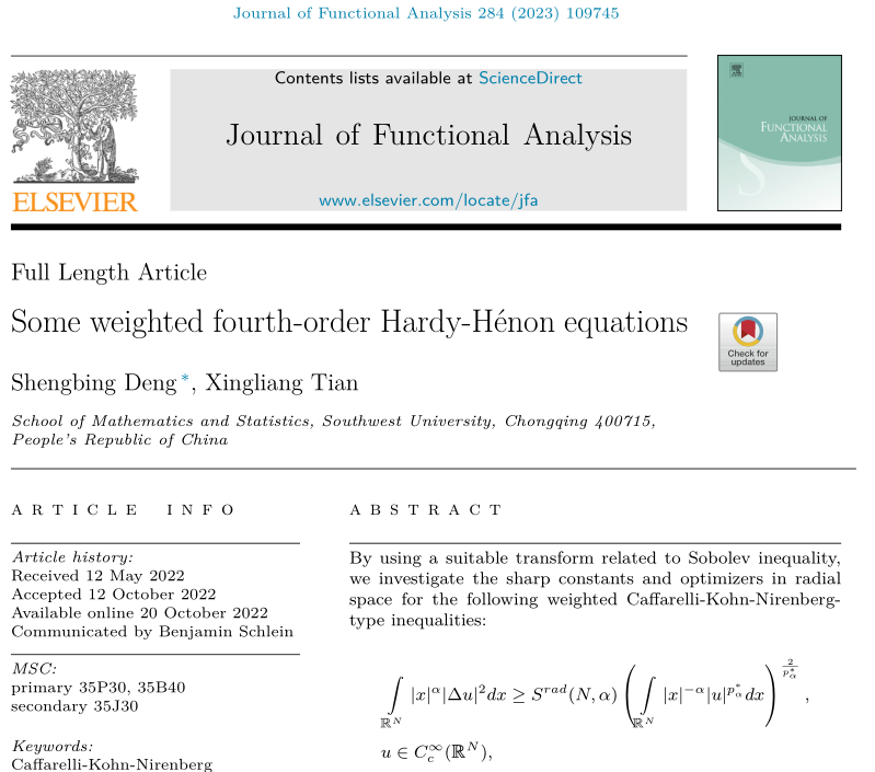 近日,学院邓圣兵教授与其博士研究生田兴亮在国际权威期刊《Journal of Functional Analysis》(泛函分析杂志)上发表了题为“Some weighted fourth-order Hardy-Hénon equations” (带权的四阶Hardy- Henon方程)的研究成果。Journal of Functional Analysis是数学领域国内外公认的一流期刊,致力于发表高水平原创性成果,具有较高学术声誉。