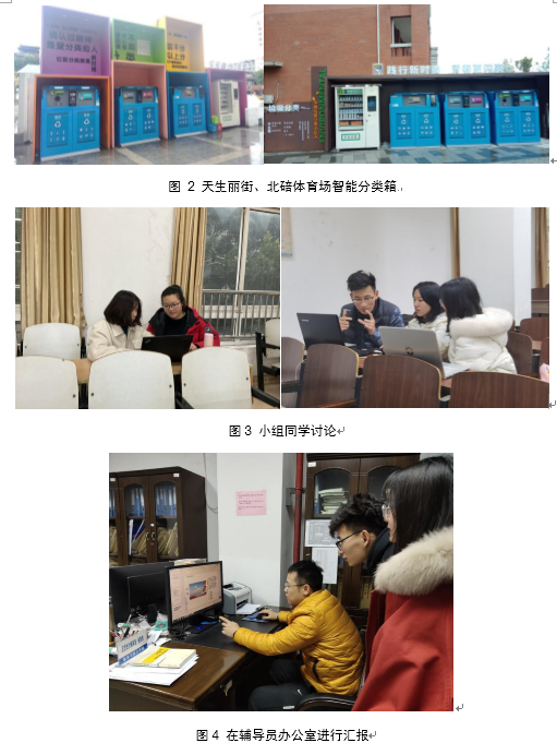 确定实践内容之后,小组成员们共同上网搜集相关文件和报道数据等;之后将小组成员分成两组,第一组负责实地考查北碚区z6com·尊龙周边垃圾基础设施建设和卫生情况;第二组负责查阅整理有关垃圾分类治理的相关论文和报告。最后小组成员进行整理,并进行第一阶段任务完成情况的汇报。