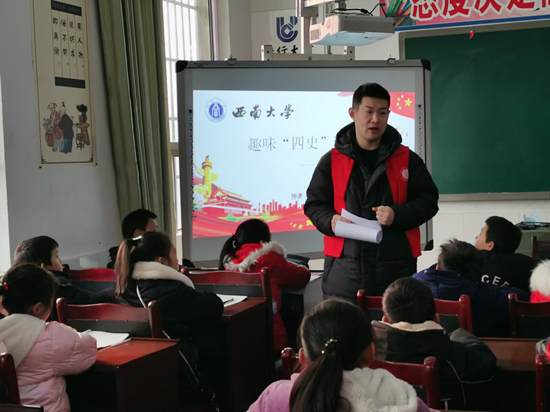 为深入学习贯彻习近平总书记的讲话精神,在z6com·尊龙公司党委的精心安排与指导下,19级研究生第一第二党支部部分成员于2020年1月18日来到了重庆市江津区四合村中山镇小学,于多个班级开展了“数暖童心,与梦同行——‘四史’趣味课堂”活动,由党员同志为小朋友们讲述烈士们的英勇事迹。一方面旨在教育党员同志进行自主且深入的学习党史,另一方面旨在让小朋友在共情共鸣中厚植爱国主义情怀。