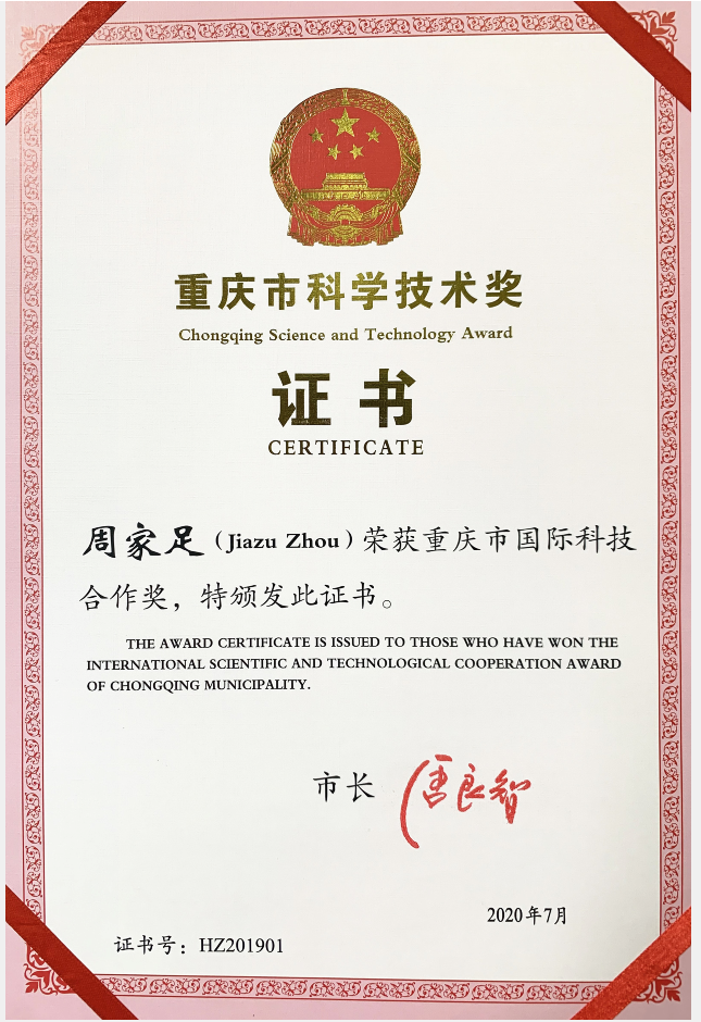 9月22日,重庆市科学技术奖励大会在渝州宾馆隆重举行。公司周家足教授荣获2019年度重庆市国际科技合作奖,这是周家足教授在获得2018年度中国政府授予外国专家最高荣誉——“中国政府友谊奖”之后,获得的又一重要奖项。