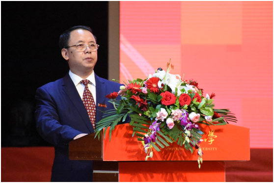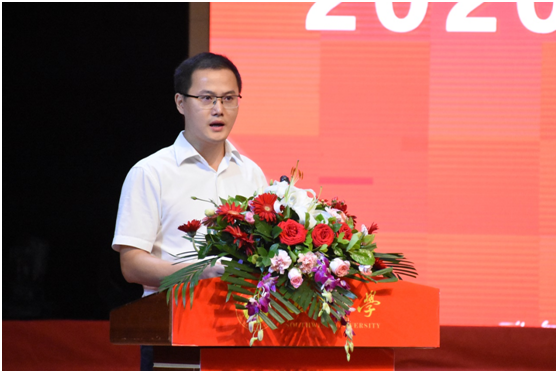 党委书记易遵尧为新生致辞,他代表学院向全体新生的到来表示热烈的欢迎。易书记向大家介绍了学院的发展历史,并从团队力量、学术、员工获奖等方面介绍了近几年学院取得的成绩。最后,易书记勉励同学们在大学期间要树立明确的人生目标,不断学习,充实自我,用好“加减乘除”法则,过好无悔青春,努力成为有理想、有本领、有担当的新时代奋进者。