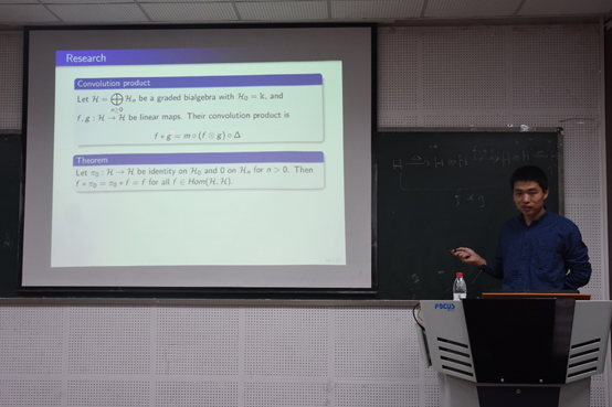 加拿大约克大学博士、约克大学及香港浸会大学博士后李舒啸进行了关于“Hopf代数”的主题报告。在报告中,李舒啸博士向大家介绍了Holf代数的基本性质,并举例讨论,研究它们的乘法公式、对极映射、自对偶、偏序、以及peak algebra。