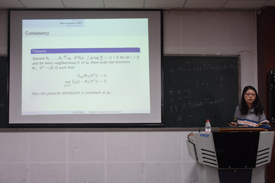 毕业于荷兰代尔夫特理工大学的庞丽雪博士就“外形约束下的贝叶斯非参估计”的相关问题进行了汇报。在报告中,庞丽雪博士形象地为大家介绍在外形约束或者说不完全数据下的贝叶斯非参数估计,并展示了给出后验分布的渐近一致性以及收缩率以及如何从后验分布中抽样的算法的研究成果;同时积极地回答了与会者的问题。