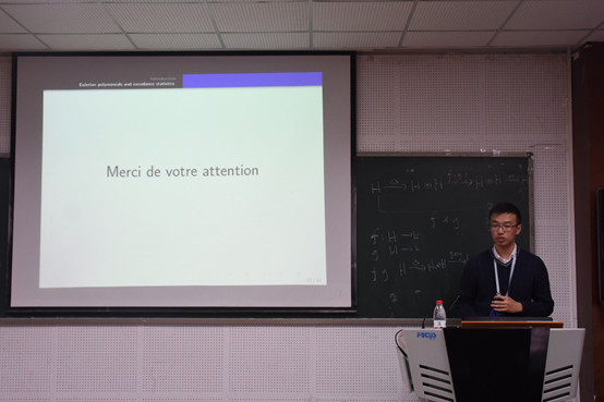之后,法国里昂第一大学毕业博士韩斌做了关于“欧拉多项式和超越统计量”的主题报告。在报告中,韩斌博士较为详细地向大家介绍了研究成果。同时也与公司师生就有关问题进行了讨论。