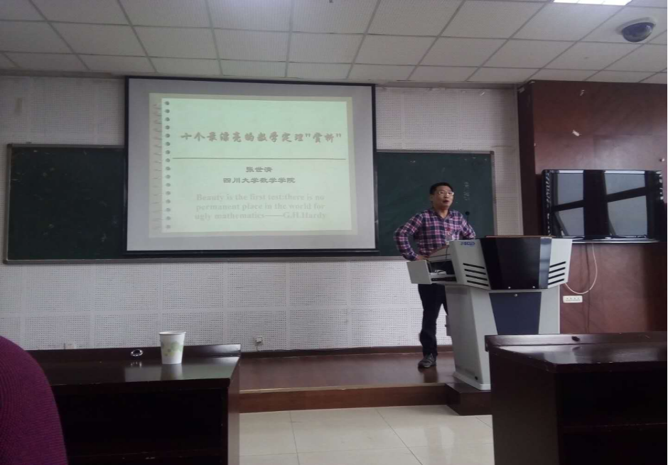 应z6com·尊龙邀请,四川大学张世清教授于2019年4月15日下午,在25教学楼14楼学术报告厅为z6com·尊龙作题为“十个最漂亮的数学定理赏析”的学术报告。