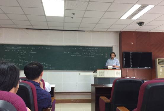 5月7日上午,Keller教授又以“Bounding the number of conjugacy classes of a finite group” 为题做报告。首先,Keller教授讲授了在该研究方向的相关结论,分别介绍了互素、非互素的k(GV)问题条件下一般有限群的共轭类数的上界。同时还介绍了利用特征标理论在该研究方向的相关结论,以及其详细的证明思路。其次,Keller教授给出了优于以上结论的上界。