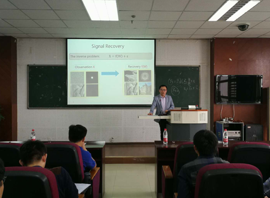 接下来,孟德宇教授在报告中向师生们介绍了传统的机器学习建模知识,以及介绍了在机器学习方法中容易出现对数据噪音的鲁棒性问题与误差函数的选择的紧密联系。随后,孟教授针对包含复杂噪音数据如何进行误差建模的鲁棒机器学习原理进行讲解,并且对其在在线视频处理、医学图像恢复等问题的应用优势进行描述。最后,孟教授希望该原理在未来能够引导出更多有趣的机器学习相关应用与发现。