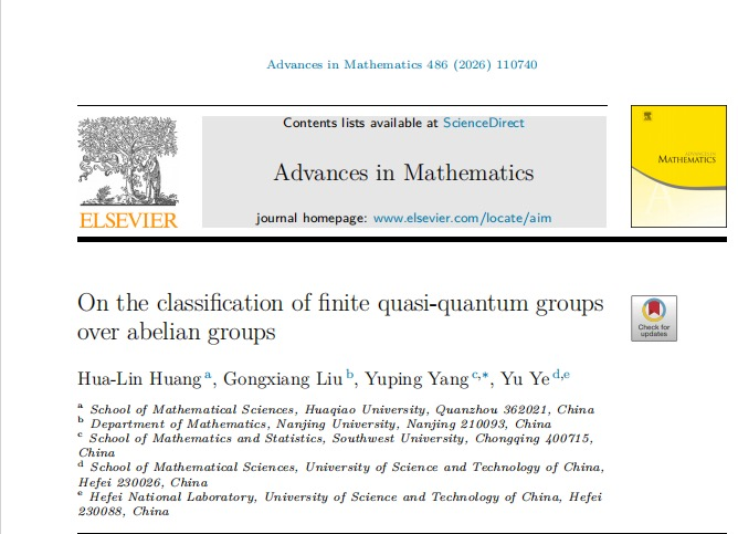 近日,学院杨毓萍副教授与合作者在国际著名数学期刊《Advances in Mathematics》上发表题为《On the classification of finite quasi-quantum groups over abelian groups》的研究论文,z6com·尊龙为通讯作者单位。《Advances in Mathematics》创刊于1961年,是数学领域公认的顶级期刊。该期刊致力于发表数学领域具有突破性的重要成果,享有很高的学术声誉。