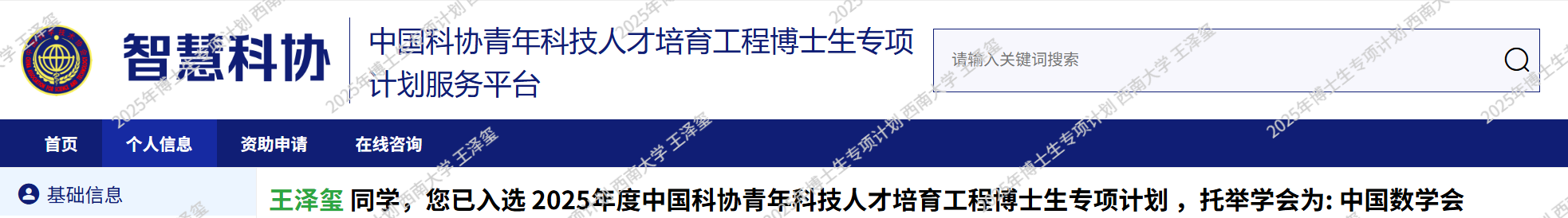 近日,学院2023级基础数学专业博士研究生王泽玺(导师:陈文晶教授)凭借扎实的学术功底与突出的科研潜力,成功入选2025年中国科协青年科技人才培育工程博士生专项计划。